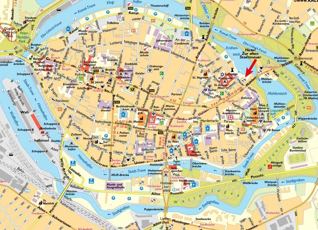 Der Lübecker Hauptbahnhof und der Busbahnhof (ZOB) sind nur etwa 1.800 Meter von unserem Hotel entfernt. In ca. 20 Minuten erreichen Sie uns bequem zu Fuß – quer über die Altstadtinsel Richtung Mühlenstraße und Krähenteich.